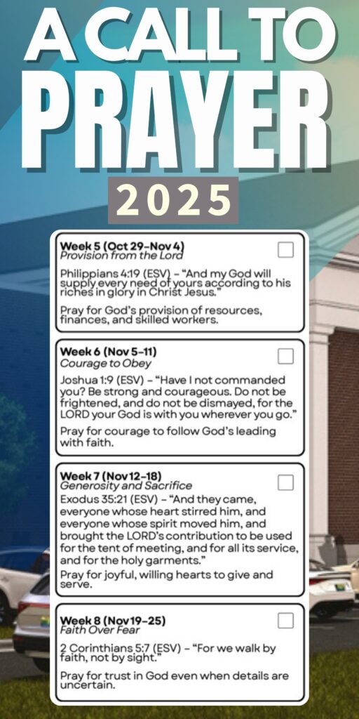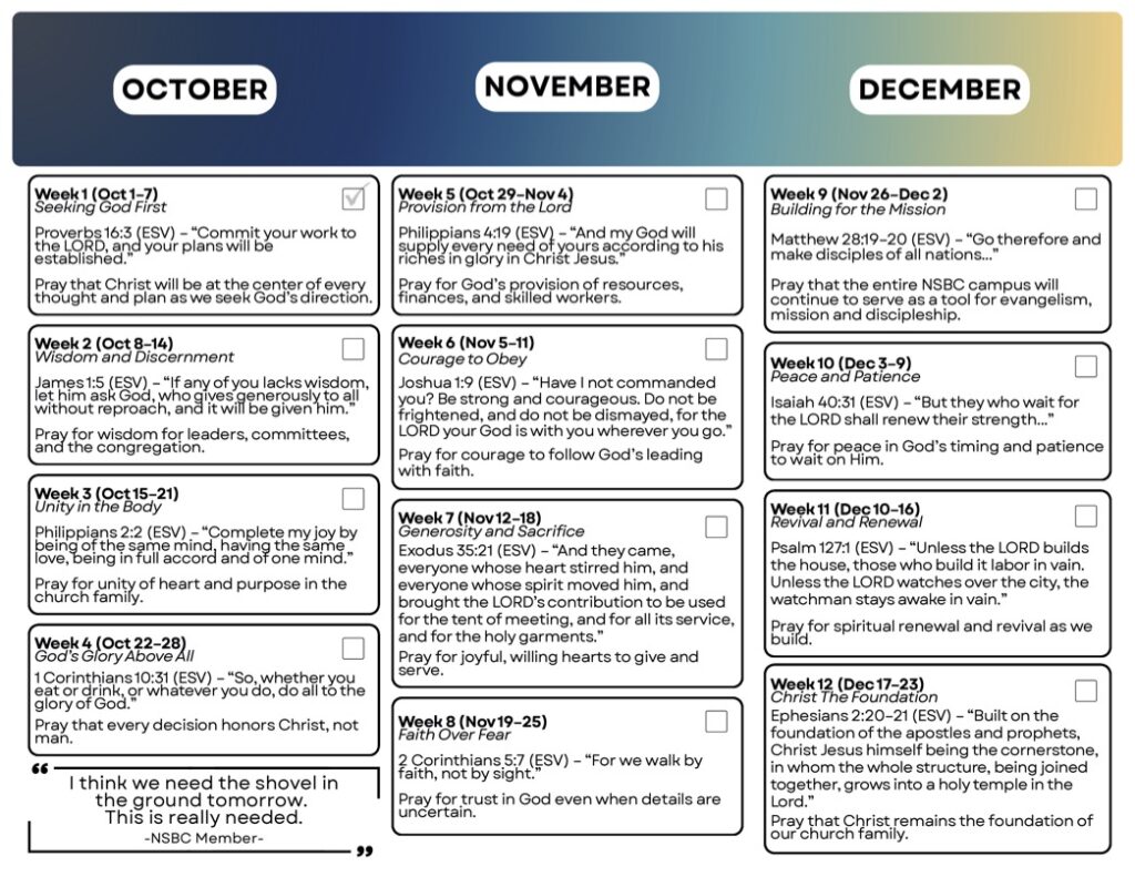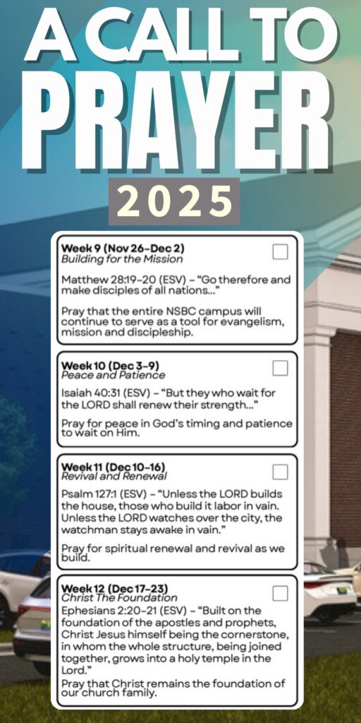 In 2021, North Shelby Baptist Church adopted a multi-phased plan to focus on master development and readiness for our campus and facilities. After completing the Cultural Assessment in the summer of this year, we want to pause and pray.